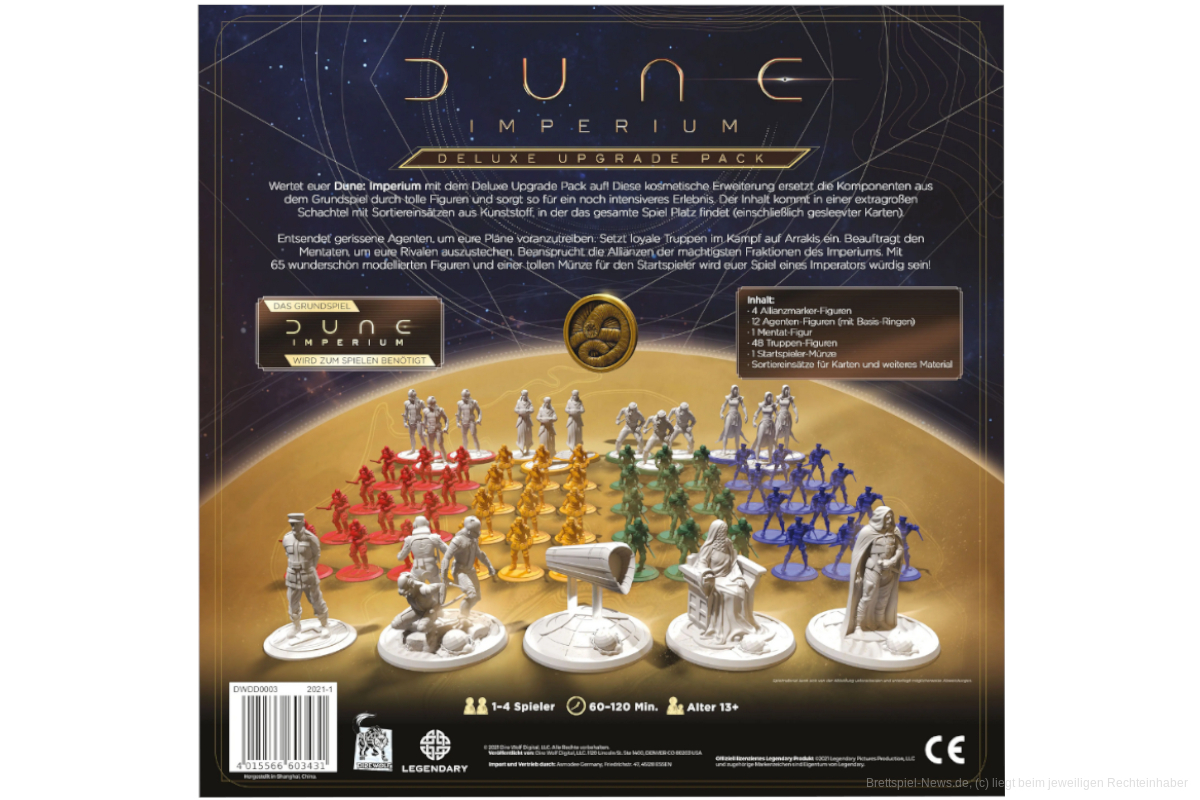 Neben 12 Agenten- und vier Allianzmarker-Figuren sind auch 48 Truppen-Figuren und eine Mentat-Figur enthalten. Daneben ist noch eine Startspieler-Münze enthalten. In der Box findet sich ein Sortiereinsatz aus Kunststoff, der Platz für das ganze Spiel inkl. gesleevter Karten bietet. Preislich liegt sie bei ca. 70€.