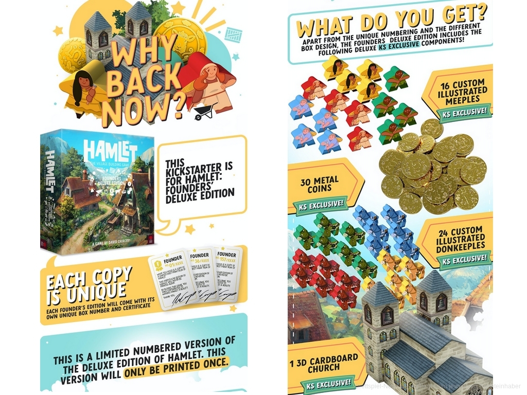 In "Hamlet" müssen die Spielerinnen und Spieler gemeinsam ein Hamlet ("kleines Dörfchen ohne Kirche") erbauen. Das Spiel endet, sobald die Dorfkirche erbaut wurde. Am Ende gewinnt die Person mit den meisten Siegpunkten. Das Spiel ist dabei für 1-4 Personen ab einem Alter von 10 Jahren geeignet und eine Partie soll zwischen 60 und 90 Minuten dauern.