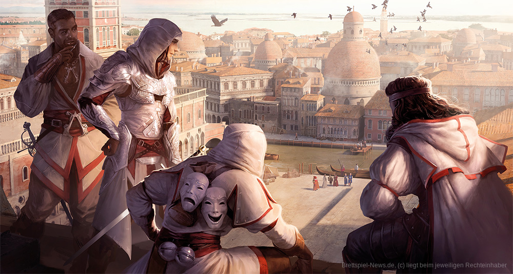 Deutschsprachige Fans der Videospielvorlage können aufhorchen: Der HeidelBär-Verlag möchte die kooperative Brettspielumsetzung "Assassin's Creed Brotherhood of Venice" im vierten Quartal 2022 auf den deutschen Markt bringen.
