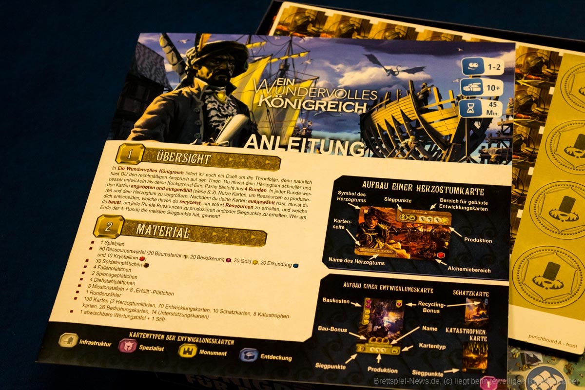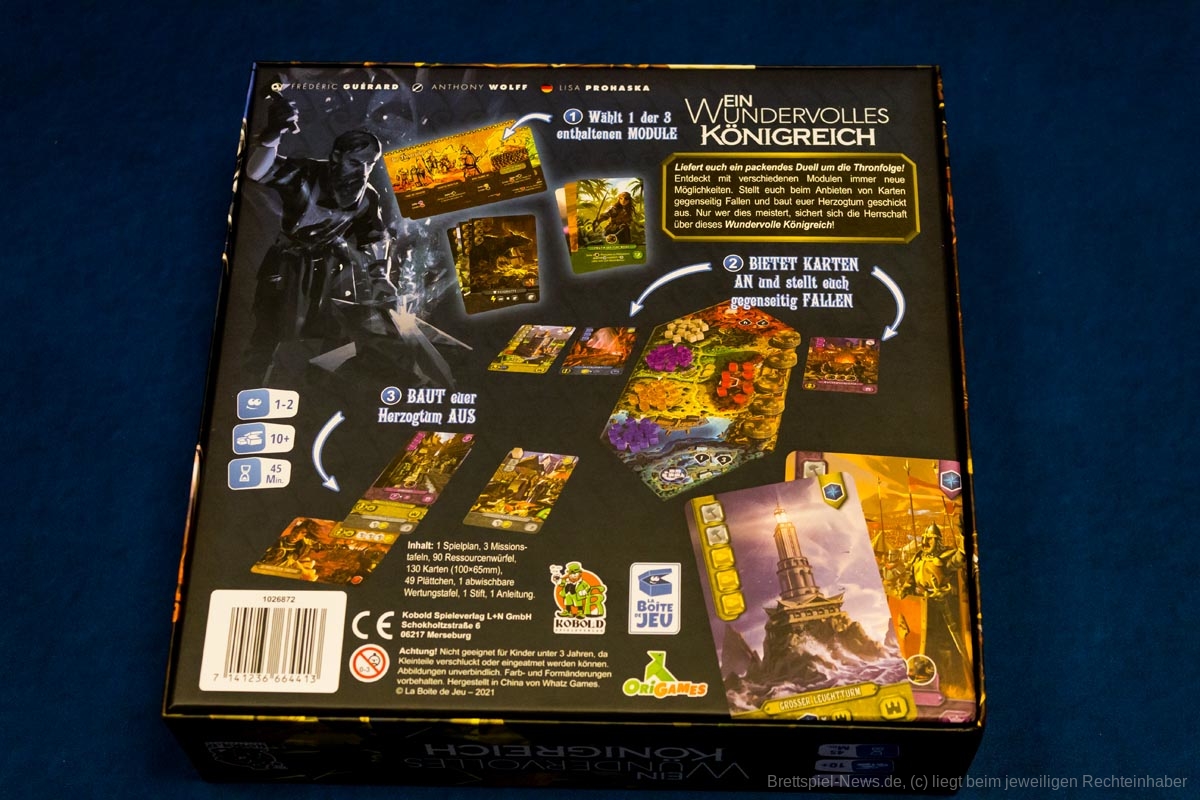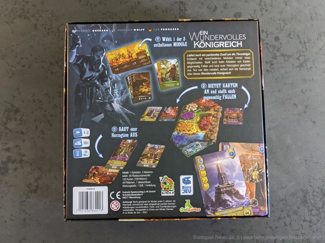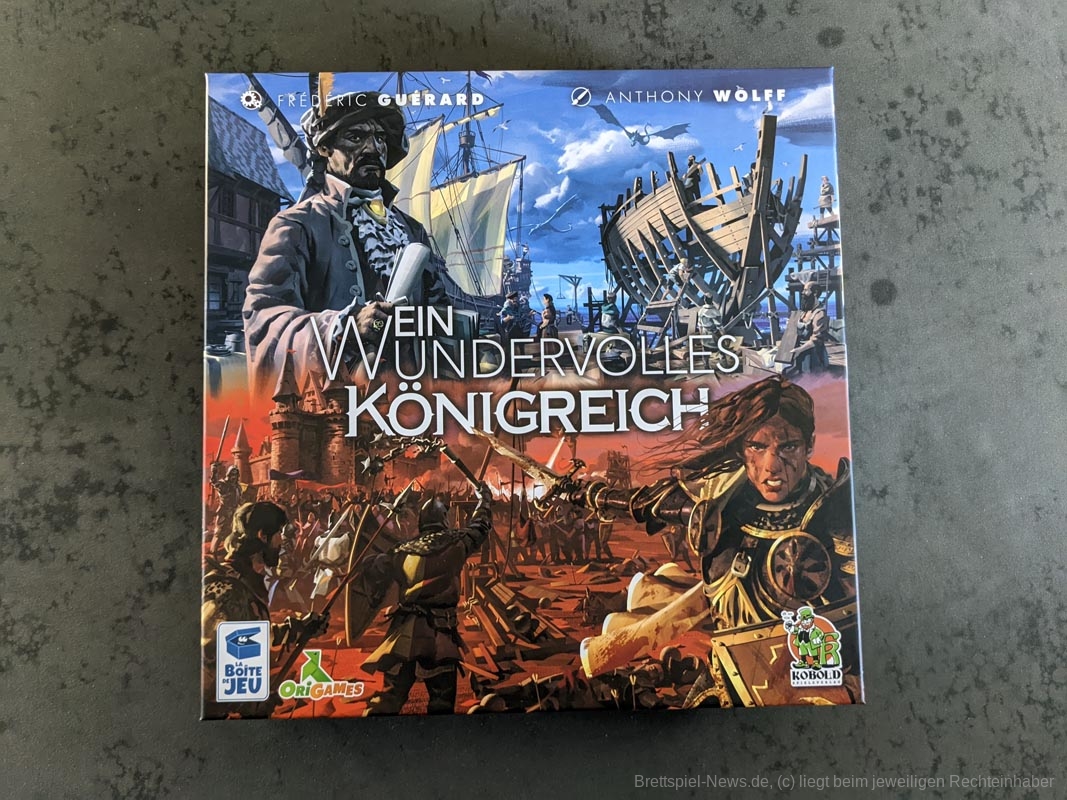 Das Spiel „Ein wundervolles Königreich“ ist der Nachfolger des sehr erfolgreichen „Eine wundervolle Welt“. Statt in die Zukunft geht es dieses Mal in das Mittelalter. Das Spiel von Frédéric Guérard hat der Kobold Verlag zu einem Preis von 29,99 € veröffentlicht. Anders als der Vorgänger richtet sich das Spiel nur an 1-2 Personen ab 14 Jahren.