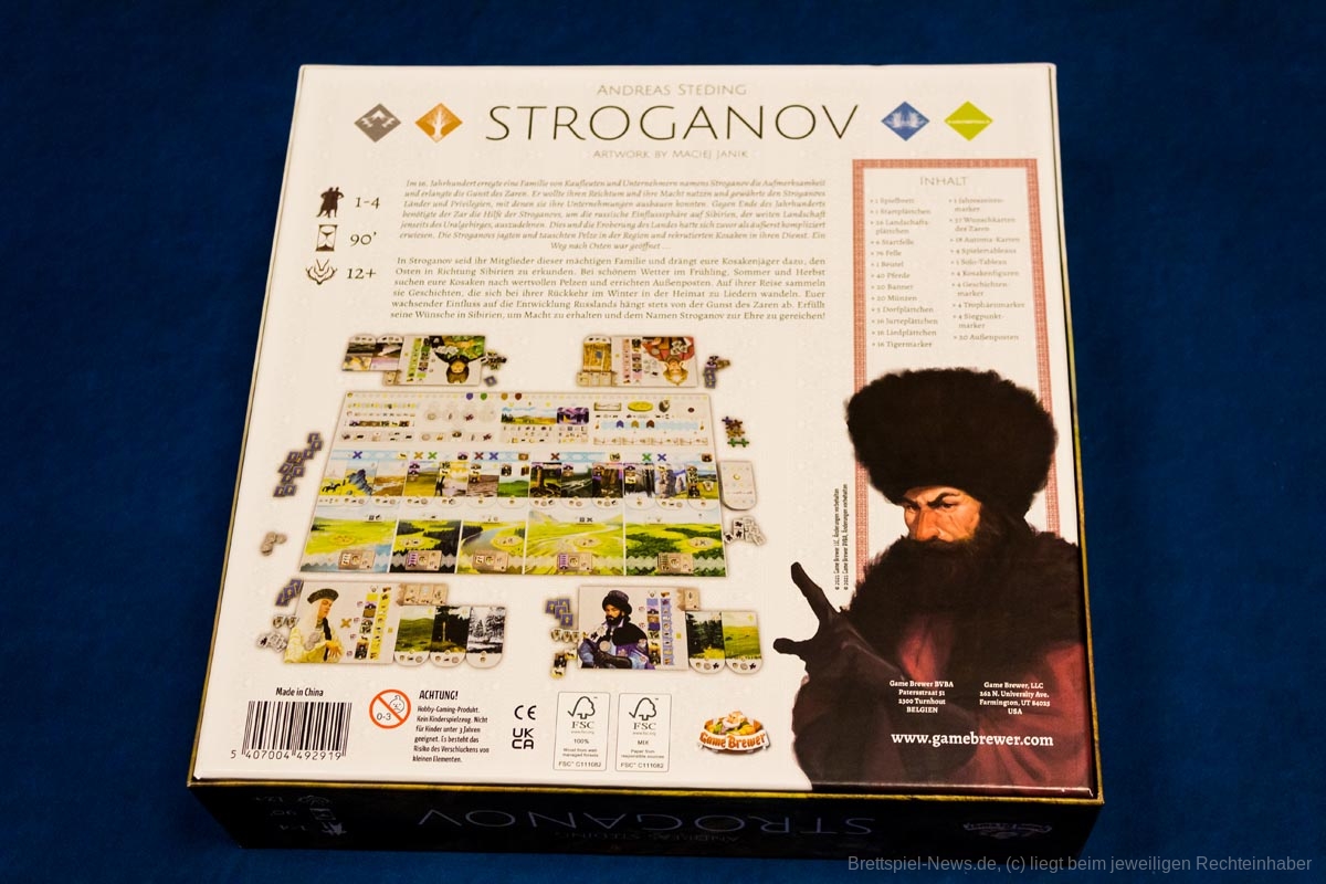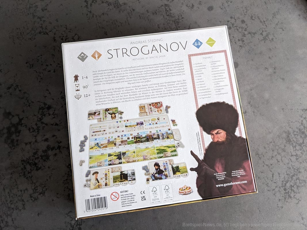 2021 hatte Game Brewer das strategische Spiel „Stroganov“ erstmals veröffentlicht. Nun ist das Spiel in größeren Mengen verfügbar und im Handel zu kaufen. Es ist sowohl solo als auch mit bis zu vier Personen spielbar. Die Spielzeit wird vom Verlag mit 90 Minuten angegeben.
