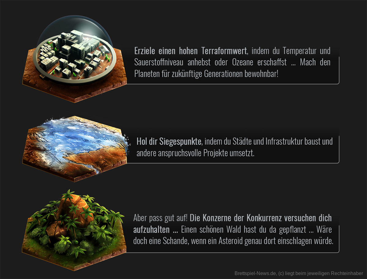 Konzerne wetteifern darum, den Mars in einen bewohnbaren Planeten zu verwandeln. Sie nutzen Unmengen an Ressourcen und innovative Technologien, um die Temperatur zu erhöhen, eine Atmosphäre, in der man atmen kann, und Ozeane voll Wasser zu erschaffen. Während das Terraforming weitergeht, werden immer mehr Menschen von der Erde auf den roten Planeten ziehen.
