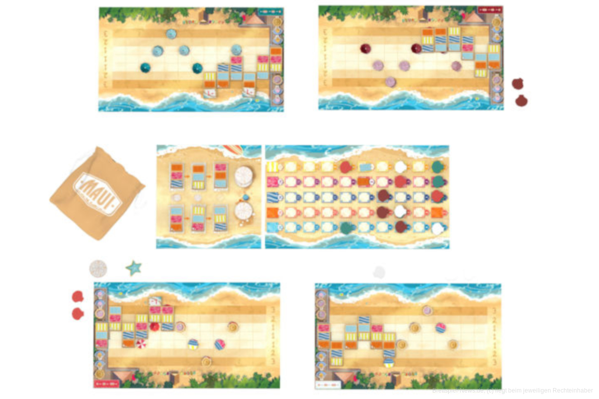 „Maui“ ist ein einfaches Plättchen-Legespiel, in dem ihr eure Strände füllt. Dafür platziert ihr Handtücher möglichst nah am Wasser oder unter den Schatten der Bäume und Sonnenschirme, um Punkte zu erhalten. Wenn ihr aber ein Handtuch so platzieren müsst, dass es außerhalb eures Feldes liegt, gibt es Minuspunkte – also passt auf.