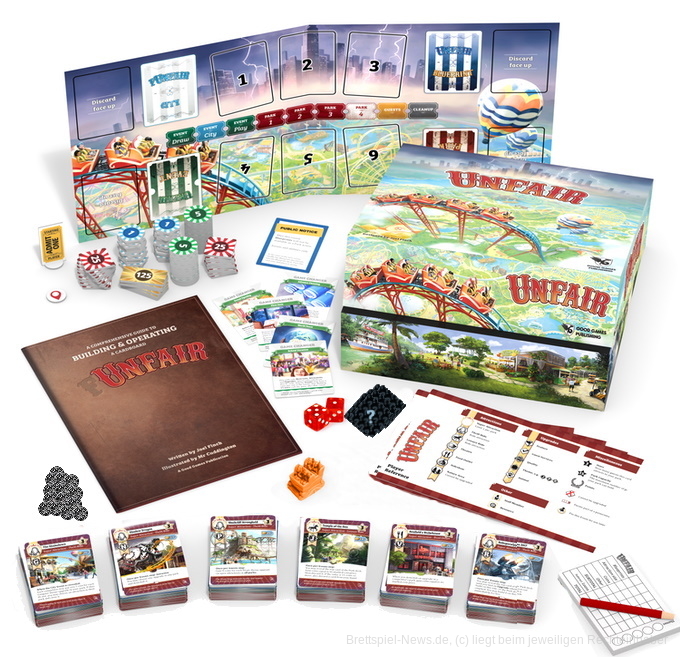 In den vergangenen Tagen startete in der Spieleschmiede die Kampagne zur deutschen Version von „Unfair“. In dem Aufbauspiel von Joel Finch, dem Autor des Vorgängers Funfair, errichten 2-5 Personen ihre eigenen Freizeitparks – auch mit unfairen Mitteln, wie Bestechung oder Erpressung. Die Spielzeit soll etwa 25 Minuten pro Person betragen.