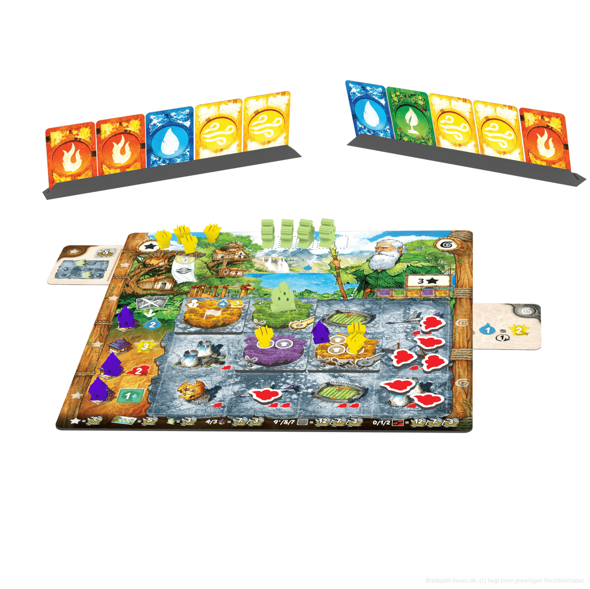 Wenn jemand sein 5. Dorf gebaut hat, ist das Spiel zu Ende. Die Person mit den meisten Punkten, abhängig von der Umweltverschmutzung, den Dörfern, den Tempeln, der Gestaltung der Wälder und anderen Zielen, gewinnt das Spiel!