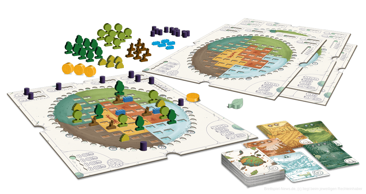 Bei „Evergreen“ geht es darum, auf dem eigenen Planeten das grünste und fruchtbarste Ökosystem zu erschaffen. Durch das Nehmen einer Biomkarte aus der allgemeinen Auslage bestimmen wir, welches Gebiet auf unserem Planeten wir in der aktuellen Runde entwickeln wollen. Wir pflanzen Büsche, lassen Bäume wachsen und platzieren Seen. Idealerweise siedeln wir unsere Bäume auf den fruchtbarsten Bereichen an, ohne dass sie sich gegenseitig überschatten.