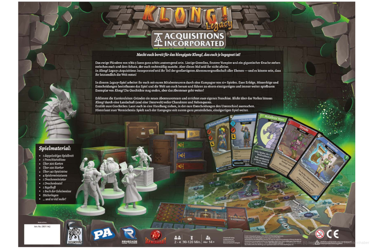 Mit „Klong! - Legacy“ erscheint die deutsche Version eines weiteren Ablegers der „Klong!“-Reihe beim Schwerkraft Verlag. 2-4 Personen ab 12 Jahren starten in ihr persönliches Abenteuer. Die Spieldauer liegt bei ca. 120 Minuten. Die UVP liegt bei 125 €.