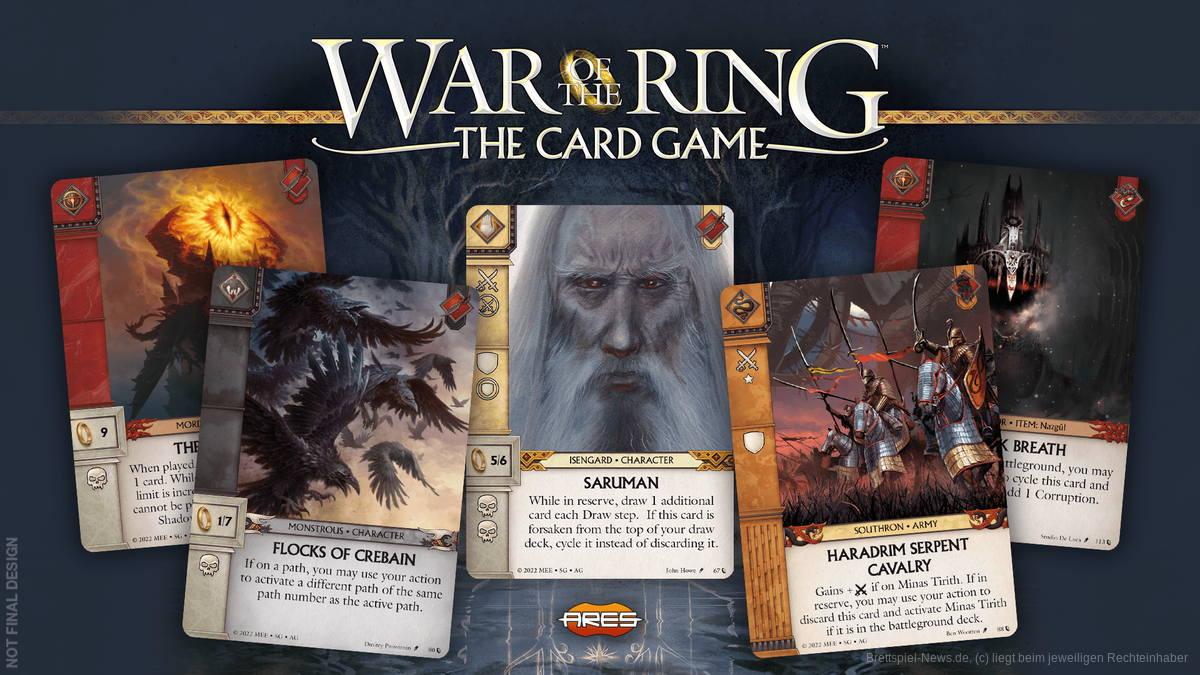 Auf der Website von Ares Games und bei FantasyWelt lässt sich „War of the Ring – The Card Game“ bereits vorbestellen. Es soll voraussichtlich im November 2022 erscheinen. Einer der Autoren des Spiels hatte bereits im Juni angekündigt, dass die neue Version bereits auf der SPIEL ’22 in Essen im Oktober verfügbar oder zumindest anspielbar sein soll. Über eine deutsche Übersetzung ist noch nichts bekannt.