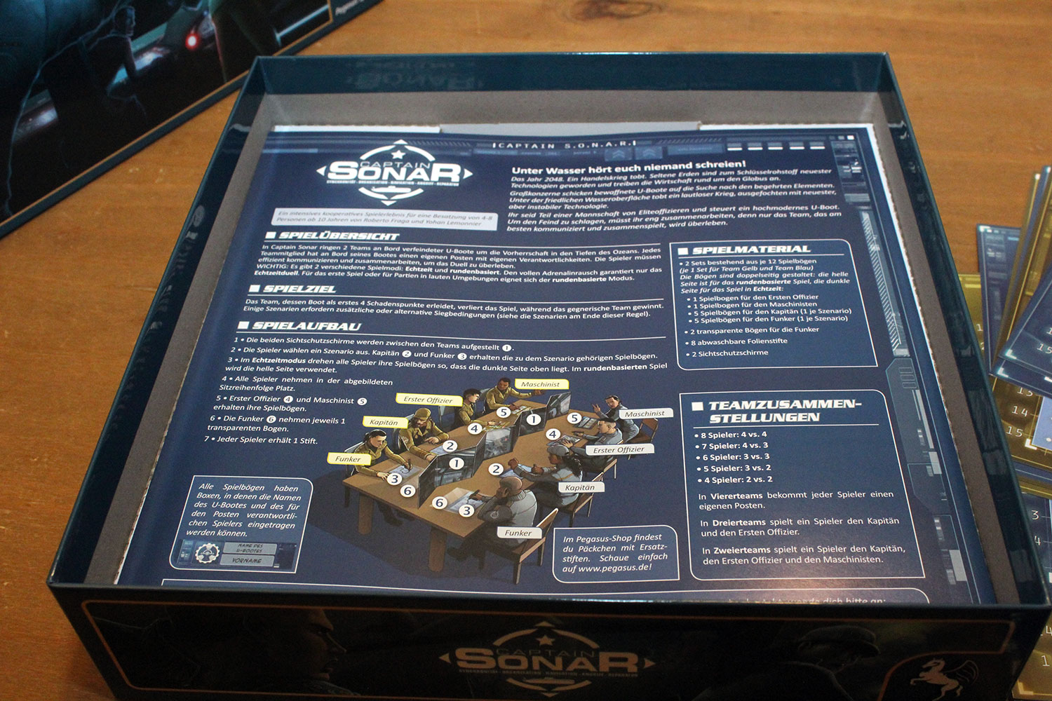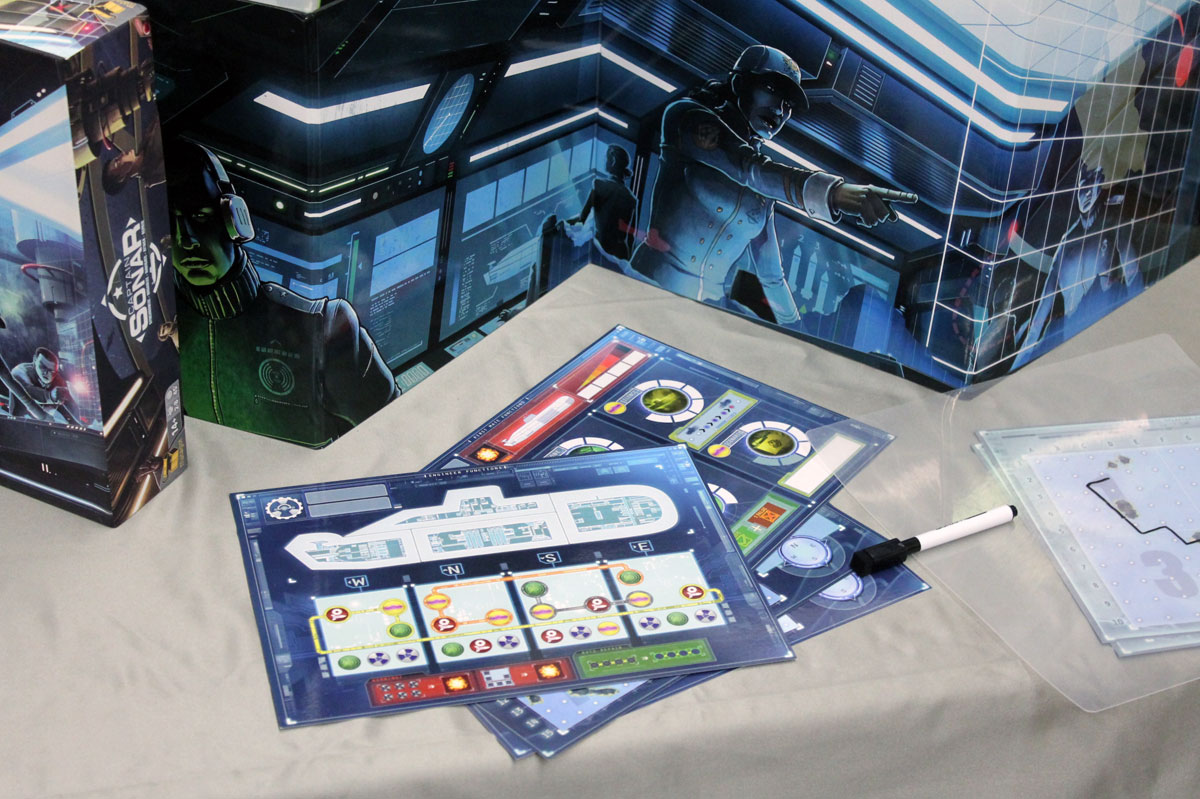 Erfolgs-Autor Roberto Fraga hat das klassische Spielprinzip von Schiffe versenken erweitert und daraus ein Echtzeitspiel für bis zu acht Spieler ab zehn Jahren entwickelt. Nur von einem Sichtschirm getrennt, sitzen sich bei Captain Sonar zwei Gruppen mit je bis zu vier Spielern gegenüber. Jeder Spieler übernimmt dabei die Rolle eines wichtigen Besatzungsmitglieds. Während der Kapitän den Kurs des eigenen U-Bootes vorgibt und den Rest seiner Besatzung koordiniert, versucht der Funker anhand der Ansagen des anderen Kapitäns, den Kurs des konkurrierenden U-Bootes zu ermitteln. Der Erste Offizier bereitet den Einsatz der Bordtechnik vor und gibt dem Kapitän Bescheid, wenn beispielsweise das Sonar oder ein Torpedo bereit sind. Und der Maschinist hält die Systeme einsatzbereit und behält im Blick, ob Reparaturen ein Auftauchen des U-Boots erfordern.Ein Team verliert, wenn das eigene U-Boot zu viele Schäden während der Fahrt oder durch gegnerische Treffer erlitten hat. Was einfach klingt, wird zu einer großen Herausforderung, wenn beide Teams in Echtzeit versuchen, ihr Vorhaben zu koordinieren und auf die Aktionen der anderen zu achten. Eine packende Partie Captain Sonardauert 20 bis maximal 45 Minuten.