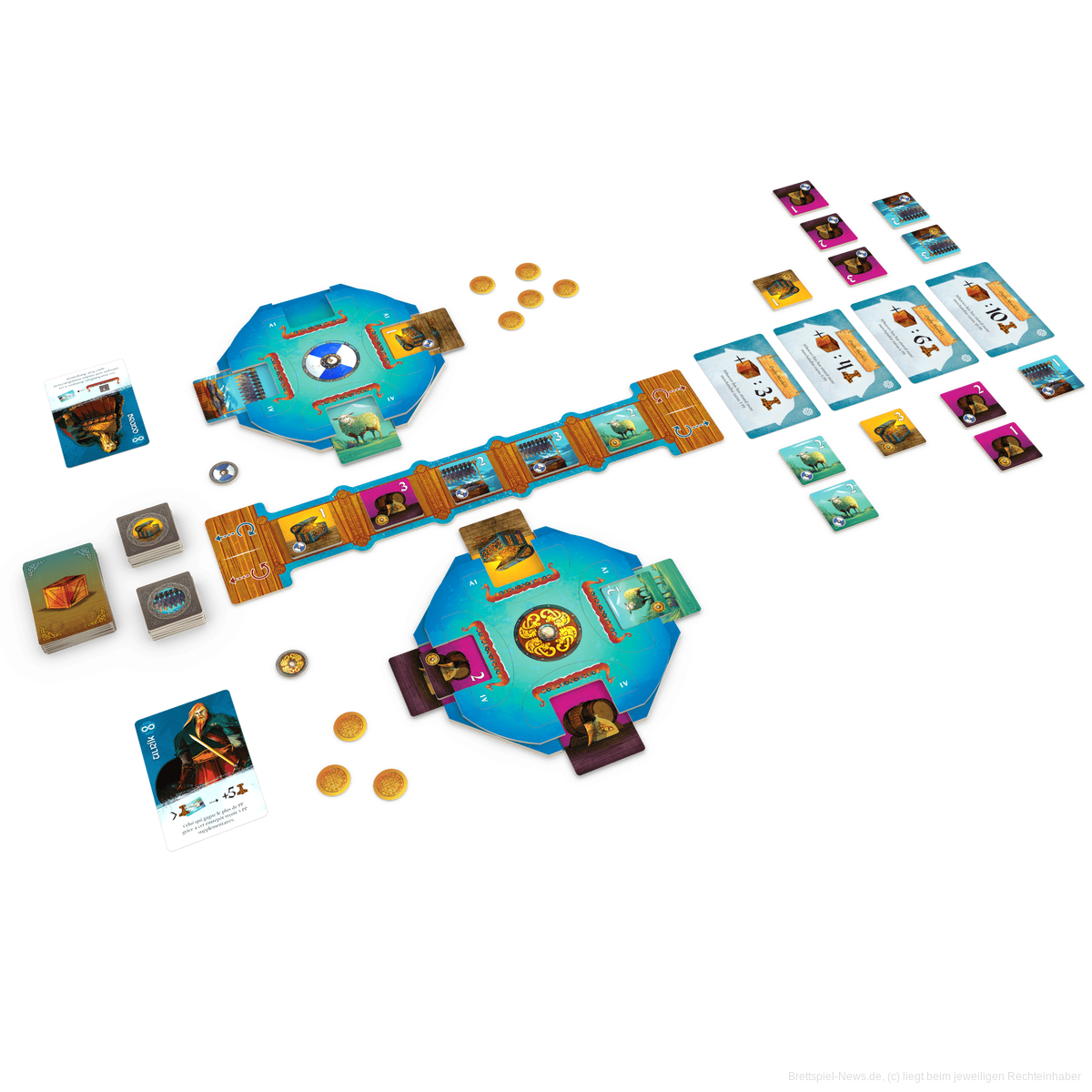 Im Spiel schlüpft ihr in die Rolle von Wikingern, die mit den wendigen Langschiff-Flotten ihrer Clans entfernte Märkte ansteuern und begehrte Waren nach Hause zu ihren Lagerhäusern bringen müssen, um ihren Einfluss zu vergrößern. Hierbei werdet ihr vor lauter taktische Entscheidungen gestellt, denn ihr dürft zwar die Reihenfolge der Auftragskarten auf eurer Hand nicht verändern, dafür sind aber eure Flottentableaus umso wendiger: Durch horizontales Bewegen oder Drehen um 90 Grad ergeben sich für euch stetig neue Optionen, um die besten Warenplättchen zu sichern. Wer von euch beiden am Ende den meisten Einfluss hat, wird der neue Jarl der Lofoten.